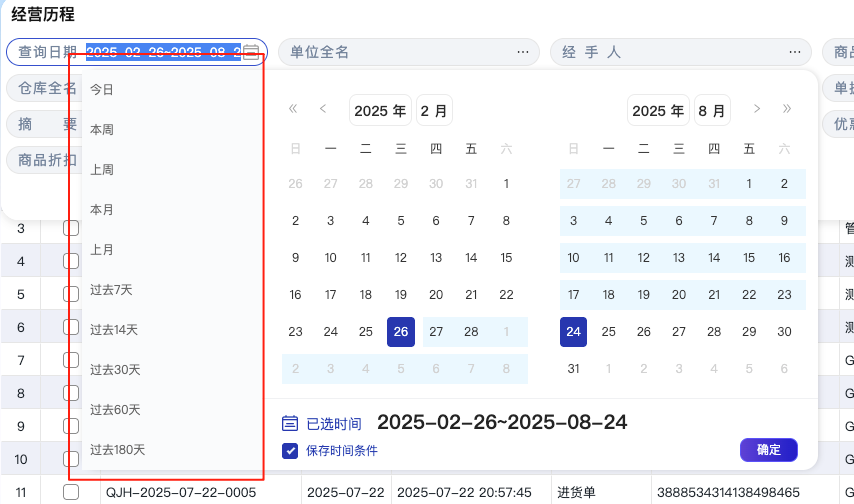 2、查询日期支持智能快捷选择,常用范围一键直达,查询更高效。